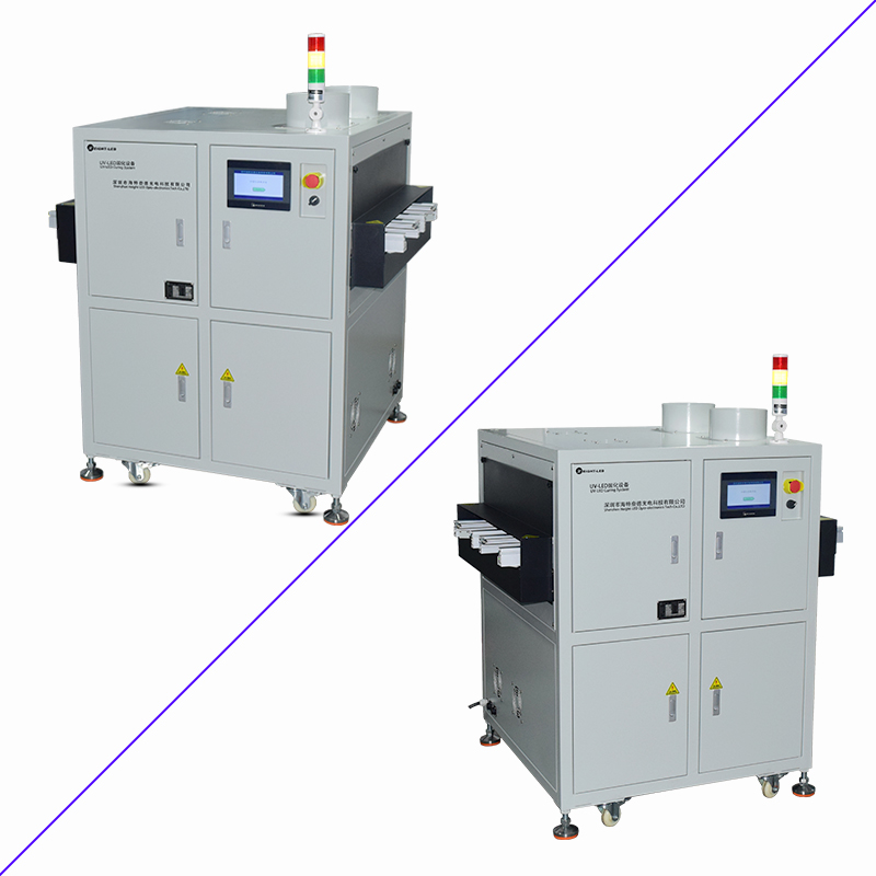 2、設(shè)備提供聯(lián)機模式和單機模式可選,聯(lián)機模式下,本機通過SMEMA通信方式,跟上位機和下位機進行物料對接并固化,單機模式下,點擊啟動按鈕,UV機輸送帶及UVLED一直工作(UVLED可以屏蔽),點擊停止按鈕,傳送帶及UVLED停止工作。